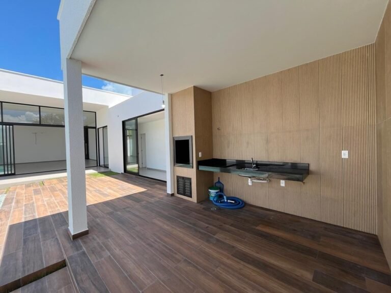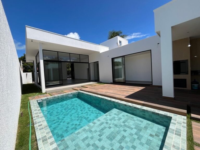 Casa com 3 suítes, sala para vários ambientes, lavabo, cozinha, área de serviço, depósito, espaço gourmet, piscinas , banheiro de apoio, varanda, jardim e garagem.